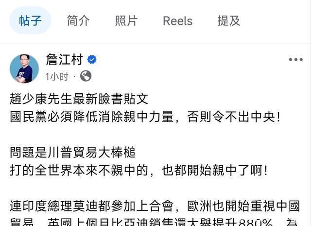詹江村的意思很直白,就是中国国民党不能丢了和大陆沟通的基本盘。这一点不光是历史传承,也是现实所需。 两岸经济联动、人员往来、产业协作,哪一项都不是轻轻松松就能切割开的。 如果一味跟风所谓的“去中化”,不仅会失去自身特色,还可能被边缘化得更快。 更关键的是,对两岸关系的态度并不是一个可以随意漂移的位置。中国国民党之所以有别于民进党,就是因为始终坚持和平发展、对话协商的路线。 现在赵少康一口气要“清除亲中力量”,听起来像是要把这条路线一刀切,结果不仅没能扩大支持,反而让党内团结更难了。 而且,站在实际角度来看,不管是经济还是民生,台湾地区长期依赖大陆市场已经是事实。这不是哪个人一句话能改变的。