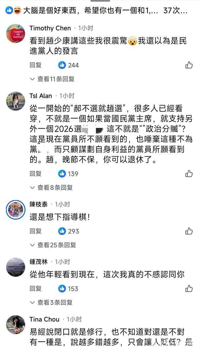 他想通过调整立场,来降低外部压力,同时提升在岛内年轻选民中的接受度。但问题在于,这种调整本身就意味着在党内掀起风浪。 而风浪一旦起来,想再让船稳下来,就不是靠一两句口号就能解决的了。 结语 赵少康这篇迟到的声明,看起来只是一段个人感想,实际上却像是话里有话,把中国国民党内部长期存在的路线分歧彻底撕了个口子。 他没为郑丽文的胜选送上祝福,却用一句“消除亲中力量”给党内部贴上标签,这种做法既让人尴尬,也让人警醒。 中国国民党如今处在一个关键转折点上:要继续坚持务实的两岸路线,还是顺着外部压力调整方向?